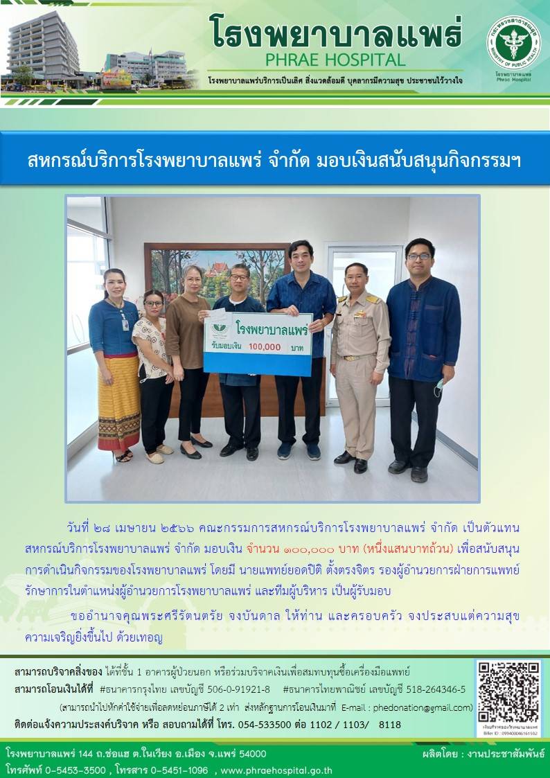 มอบเงินสนับสนุนสวัสดิการให้กับโรงพยาบาลแพร่